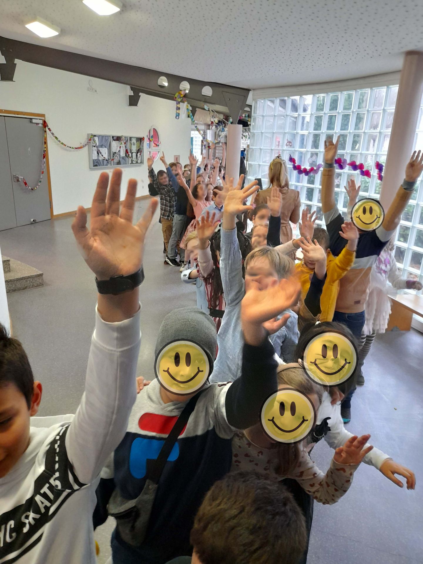 führte am Freitag eine lange Polonaise durch das Schulhaus alle Schüler und Schülerinnen in die Sporthalle. Dort fand in der 3. und 4. Stunde die Faschingsparty statt.